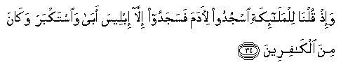 34. Wa-ith qulna lilmala-ikati osjudoo li-adama fasajadoo illa ibleesa aba waistakbara wakana mina alkafireena