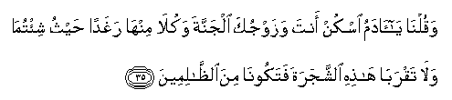 35. Waqulna ya adamu oskun anta wazawjuka aljannata wakula minha raghadan haythu shi/tuma wala taqraba hathihi alshshajarata fatakoona mina alththalimeena