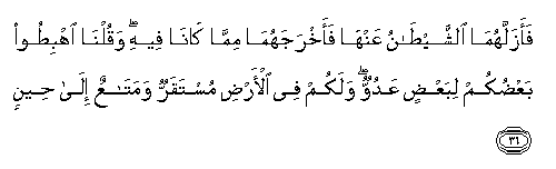 36. Faazallahuma alshshaytanu AAanha faakhrajahuma mimma kana feehi waqulna ihbitoo baAAdukum libaAAdin AAaduwwun walakum fee al-ardi mustaqarrun wamataAAun ila heenin