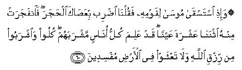 60. Wa-ithi istasqa moosa liqawmihi faqulna idrib biAAasaka alhajara fainfajarat minhu ithnata AAashrata AAaynan qad AAalima kullu onasin mashrabahum kuloo waishraboo min rizqi Allahi wala taAAthaw fee al-ardi mufsideena