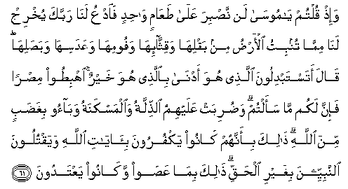 61. Wa-ith qultum ya moosa lan nasbira AAala taAAamin wahidin faodAAu lana rabbaka yukhrij lana mimma tunbitu al-ardu min baqliha waqiththa-iha wafoomiha waAAadasiha wabasaliha qala atastabdiloona allathee huwa adna biallathee huwa khayrun ihbitoo misran fa-inna lakum ma saaltum waduribat AAalayhimu alththillatu waalmaskanatu wabaoo bighadabin mina Allahi thalika bi-annahum kanoo yakfuroona bi-ayati Allahi wayaqtuloona alnnabiyyeena bighayri alhaqqi thalika bima AAasaw wakanoo yaAAtadoona