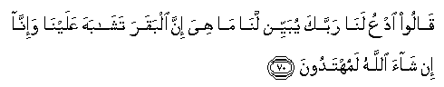 70. Qaloo odAAu lana rabbaka yubayyin lana ma hiya inna albaqara tashabaha AAalayna wa-inna in shaa Allahu lamuhtadoona