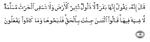 71. Qala innahu yaqoolu innaha baqaratun la thaloolun tutheeru al-arda wala tasqee alhartha musallamatun la shiyata feeha qaloo al-ana ji/ta bialhaqqi fathabahooha wama kadoo yafAAaloona