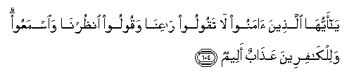 104. Ya ayyuha allatheena amanoo la taqooloo raAAina waqooloo onthurna waismaAAoo walilkafireena AAathabun aleemun