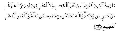 105. Ma yawaddu allatheena kafaroo min ahli alkitabi wala almushrikeena an yunazzala AAalaykum min khayrin min rabbikum waAllahu yakhtassu birahmatihi man yashao waAllahu thoo alfadli alAAatheemi