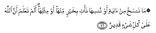 106. Ma nansakh min ayatin aw nunsiha na/ti bikhayrin minha aw mithliha alam taAAlam anna Allaha AAala kulli shay-in qadeerun