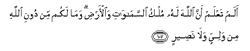 107. Alam taAAlam anna Allaha lahu mulku alssamawati waal-ardi wama lakum min dooni Allahi min waliyyin wala naseerin