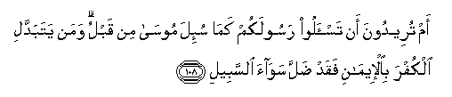 108. Am tureedoona an tas-aloo rasoolakum kama su-ila moosa min qablu waman yatabaddali alkufra bial-eemani faqad dalla sawaa alssabeeli