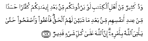109. Wadda katheerun min ahli alkitabi law yaruddoonakum min baAAdi eemanikum kuffaran hasadan min AAindi anfusihim min baAAdi ma tabayyana lahumu alhaqqu faoAAfoo waisfahoo hatta ya/tiya Allahu bi-amrihi inna Allaha AAala kulli shay-in qadeerun