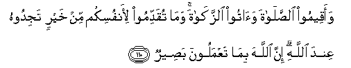 110. Waaqeemoo alssalata waatoo alzzakata wama tuqaddimoo li-anfusikum min khayrin tajidoohu AAinda Allahi inna Allaha bima taAAmaloona baseerun