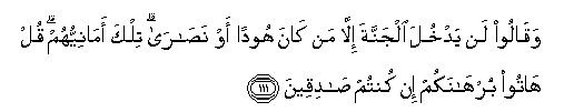 111. Waqaloo lan yadkhula aljannata illa man kana hoodan aw nasara tilka amaniyyuhum qul hatoo burhanakum in kuntum sadiqeena