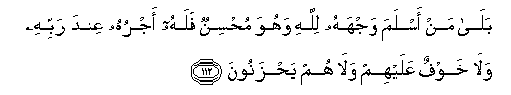 112. Bala man aslama wajhahu lillahi wahuwa muhsinun falahu ajruhu AAinda rabbihi wala khawfun AAalayhim wala hum yahzanoona