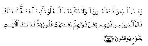118. Waqala allatheena la yaAAlamoona lawla yukallimuna Allahu aw ta/teena ayatun kathalika qala allatheena min qablihim mithla qawlihim tashabahat quloobuhum qad bayyanna al-ayati liqawmin yooqinoona