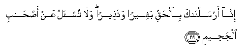 119. Inna arsalnaka bialhaqqi basheeran wanatheeran wala tus-alu Aaan as-habi aljaheemi