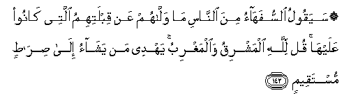 142. Sayaqoolu alssufahao mina alnnasi ma wallahum AAan qiblatihimu allatee kanoo AAalayha qul lillahi almashriqu waalmaghribu yahdee man yashao ila siratin mustaqeemin