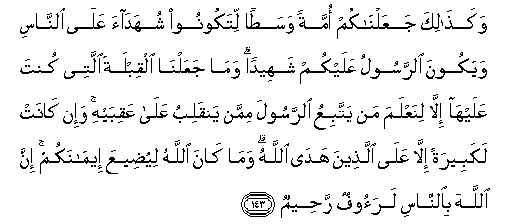 143. Wakathalika jaAAalnakum ommatan wasatan litakoonoo shuhadaa AAala alnnasi wayakoona alrrasoolu AAalaykum shaheedan wama jaAAalna alqiblata allatee kunta AAalayha illa linaAAlama man yattabiAAu alrrasoola mimman yanqalibu AAala AAaqibayhi wa-in kanat lakabeeratan illa AAala allatheena hada Allahu wama kana Allahu liyudeeAAa eemanakum inna Allaha bialnnasi laraoofun raheemun
