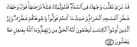144. Qad nara taqalluba wajhika fee alssama-i falanuwalliyannaka qiblatan tardaha fawalli wajhaka shatra almasjidi alharami wahaythu ma kuntum fawalloo wujoohakum shatrahu wa-inna allatheena ootoo alkitaba layaAAlamoona annahu alhaqqu min rabbihim wama Allahu bighafilin AAamma yaAAmaloona