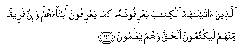 146. Allatheena ataynahumu alkitaba yaAArifoonahu kama yaAArifoona abnaahum wa-inna fareeqan minhum layaktumoona alhaqqa wahum yaAAlamoona