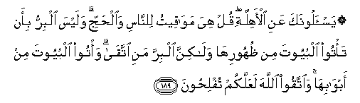 189. Yas-aloonaka AAani al-ahillati qul hiya mawaqeetu lilnnasi waalhajji walaysa albirru bi-an ta/too albuyoota min thuhooriha walakinna albirra mani ittaqa wa/too albuyoota min abwabiha waittaqoo Allaha laAAallakum tuflihoona