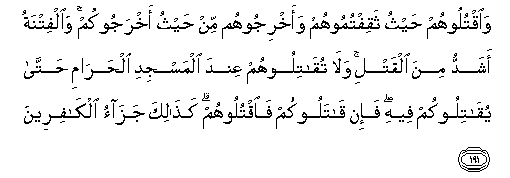 191. Waoqtuloohum haythu thaqiftumoohum waakhrijoohum min haythu akhrajookum waalfitnatu ashaddu mina alqatli wala tuqatiloohum AAinda almasjidi alharami hatta yuqatilookum feehi fa-in qatalookum faoqtuloohum kathalika jazao alkafireena