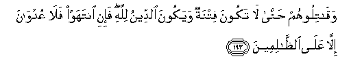 193. Waqatiloohum hatta la takoona fitnatun wayakoona alddeenu lillahi fa-ini intahaw fala AAudwana illa AAala alththalimeena