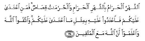 194. Alshshahru alharamu bialshshahri alharami waalhurumatu qisasun famani iAAtada AAalaykum faiAAtadoo AAalayhi bimithli ma iAAtada AAalaykum waittaqoo Allaha waiAAlamoo anna Allaha maAAa almuttaqeena