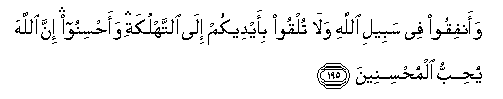 195. Waanfiqoo fee sabeeli Allahi wala tulqoo bi-aydeekum ila alttahlukati waahsinoo inna Allaha yuhibbu almuhsineena