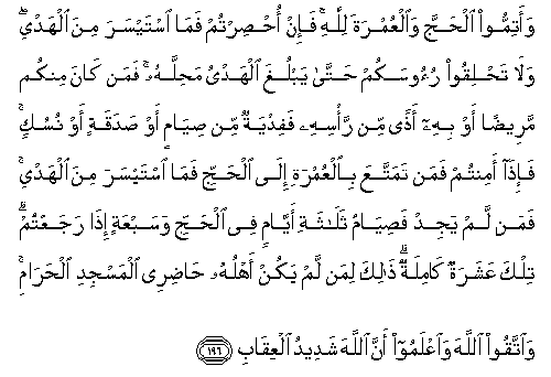 196. Waatimmoo alhajja waalAAumrata lillahi fa-in ohsirtum fama istaysara mina alhadyi wala tahliqoo ruoosakum hatta yablugha alhadyu mahillahu faman kana minkum mareedan aw bihi athan min ra/sihi fafidyatun min siyamin aw sadaqatin aw nusukin fa-itha amintum faman tamattaAAa bialAAumrati ila alhajji fama istaysara mina alhadyi faman lam yajid fasiyamu thalathati ayyamin fee alhajji wasabAAatin itha rajaAAtum tilka AAasharatun kamilatun thalika liman lam yakun ahluhu hadiree almasjidi alharami waittaqoo Allaha waiAAlamoo anna Allaha shadeedu alAAiqabi