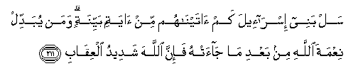 211. Sal banee isra-eela kam ataynahum min ayatin bayyinatin waman yubaddil niAAmata Allahi min baAAdi ma jaat-hu fa-inna Allaha shadeedu alAAiqabi