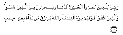 212. Zuyyina lillatheena kafaroo alhayatu alddunya wayaskharoona mina allatheena amanoo waallatheena ittaqaw fawqahum yawma alqiyamati waAllahu yarzuqu man yashao bighayri hisabin