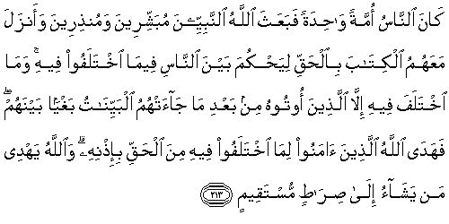 213. Kana alnnasu ommatan wahidatan fabaAAatha Allahu alnnabiyyeena mubashshireena wamunthireena waanzala maAAahumu alkitaba bialhaqqi liyahkuma bayna alnnasi feema ikhtalafoo feehi wama ikhtalafa feehi illa allatheena ootoohu min baAAdi ma jaat-humu albayyinatu baghyan baynahum fahada Allahu allatheena amanoo lima ikhtalafoo feehi mina alhaqqi bi-ithnihi waAllahu yahdee man yashao ila siratin mustaqeemin