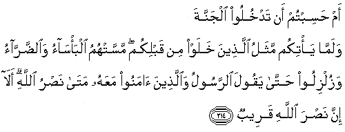 214. Am hasibtum an tadkhuloo aljannata walamma ya/tikum mathalu allatheena khalaw min qablikum massat-humu alba/sao waalddarrao wazulziloo hatta yaqoola alrrasoolu waallatheena amanoo maAAahu mata nasru Allahi ala inna nasra Allahi qareebun