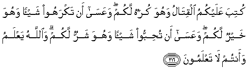 216. Kutiba AAalaykumu alqitalu wahuwa kurhun lakum waAAasa an takrahoo shay-an wahuwa khayrun lakum waAAasa an tuhibboo shay-an wahuwa sharrun lakum waAllahu yaAAlamu waantum la taAAlamoona