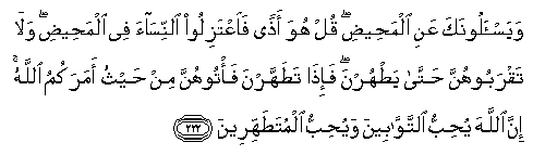 222. Wayas-aloonaka AAani almaheedi qul huwa athan faiAAtaziloo alnnisaa fee almaheedi wala taqraboohunna hatta yathurna fa-itha tatahharna fa/toohunna min haythu amarakumu Allahu inna Allaha yuhibbu alttawwabeena wayuhibbu almutatahhireena