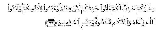 223. Nisaokum harthun lakum fa/too harthakum anna shi/tum waqaddimoo li-anfusikum waittaqoo Allaha waiAAlamoo annakum mulaqoohu wabashshiri almu/mineena