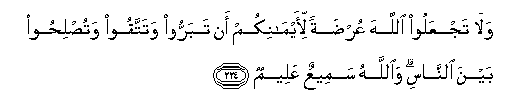 224. Wala tajAAaloo Allaha AAurdatan li-aymanikum an tabarroo watattaqoo watuslihoo bayna alnnasi waAllahu sameeAAun AAaleemun