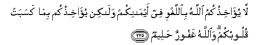 225. La yu-akhithukumu Allahu biallaghwi fee aymanikum walakin yu-akhithukum bima kasabat quloobukum waAllahu ghafoorun haleemun