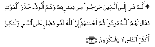 243. Alam tara ila allatheena kharajoo min diyarihim wahum oloofun hathara almawti faqala lahumu Allahu mootoo thumma ahyahum inna Allaha lathoo fadlin AAala alnnasi walakinna akthara alnnasi la yashkuroona