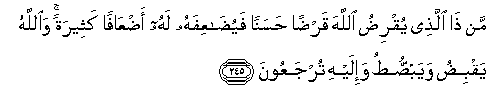 245. Man tha allathee yuqridu Allaha qardan hasanan fayudaAAifahu lahu adAAafan katheeratan waAllahu yaqbidu wayabsutu wa-ilayhi turjaAAoona