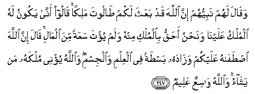 247. Waqala lahum nabiyyuhum inna Allaha qad baAAatha lakum taloota malikan qaloo anna yakoonu lahu almulku AAalayna wanahnu ahaqqu bialmulki minhu walam yu/ta saAAatan mina almali qala inna Allaha istafahu AAalaykum wazadahu bastatan fee alAAilmi waaljismi waAllahu yu/tee mulkahu man yashao waAllahu wasiAAun AAaleemun