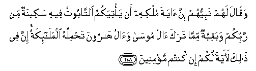 248. Waqala lahum nabiyyuhum inna ayata mulkihi an ya/tiyakumu alttabootu feehi sakeenatun min rabbikum wabaqiyyatun mimma taraka alu moosa waalu haroona tahmiluhu almala-ikatu inna fee thalika laayatan lakum in kuntum mu/mineena