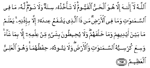 255. Allahu la ilaha illa huwa alhayyu alqayyoomu la ta/khuthuhu sinatun wala nawmun lahu ma fee alssamawati wama fee al-ardi man tha allathee yashfaAAu AAindahu illa bi-ithnihi yaAAlamu ma bayna aydeehim wama khalfahum wala yuheetoona bishay-in min AAilmihi illa bima shaa wasiAAa kursiyyuhu alssamawati waal-arda wala yaooduhu hifthuhuma wahuwa alAAaliyyu alAAatheemu