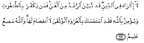 256. La ikraha fee alddeeni qad tabayyana alrrushdu mina alghayyi faman yakfur bialttaghooti wayu/min biAllahi faqadi istamsaka bialAAurwati alwuthqa la infisama laha waAllahu sameeAAun AAaleemun