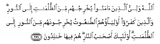 257. Allahu waliyyu allatheena amanoo yukhrijuhum mina alththulumati ila alnnoori waallatheena kafaroo awliyaohumu alttaghootu yukhrijoonahum mina alnnoori ila alththulumati ola-ika as-habu alnnari hum feeha khalidoona