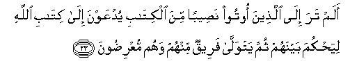 23. Alam tara ila allatheena ootoo naseeban mina alkitabi yudAAawna ila kitabi Allahi liyahkuma baynahum thumma yatawalla fareequn minhum wahum muAAridoona