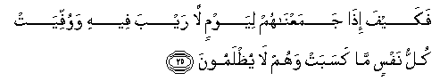 25. Fakayfa itha jamaAAnahum liyawmin la rayba feehi wawuffiyat kullu nafsin ma kasabat wahum la yuthlamoona