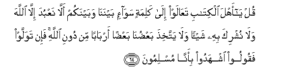 64. Qul ya ahla alkitabi taAAalaw ila kalimatin sawa-in baynana wabaynakum alla naAAbuda illa Allaha wala nushrika bihi shay-an wala yattakhitha baAAduna baAAdan arbaban min dooni Allahi fa-in tawallaw faqooloo ishhadoo bi-anna muslimoona