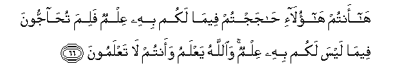 66. Ha antum haola-i hajajtum feema lakum bihi AAilmun falima tuhajjoona feema laysa lakum bihi AAilmun waAllahu yaAAlamu waantum la taAAlamoona
