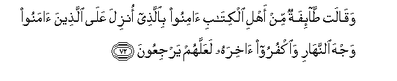 72. Waqalat ta-ifatun min ahli alkitabi aminoo biallathee onzila AAala allatheena amanoo wajha alnnahari waokfuroo akhirahu laAAallahum yarjiAAoona