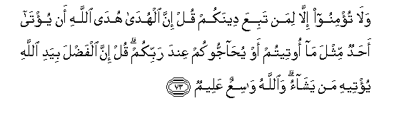 73. Wala tu/minoo illa liman tabiAAa deenakum qul inna alhuda huda Allahi an yu/ta ahadun mithla ma ooteetum aw yuhajjookum AAinda rabbikum qul inna alfadla biyadi Allahi yu/teehi man yashao waAllahu wasiAAun AAaleemun